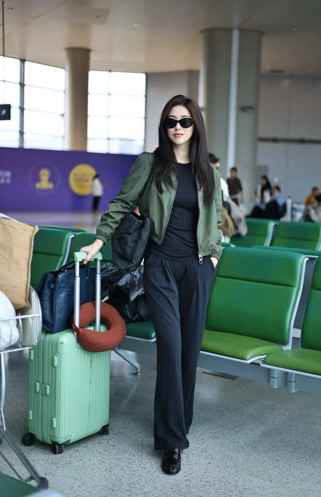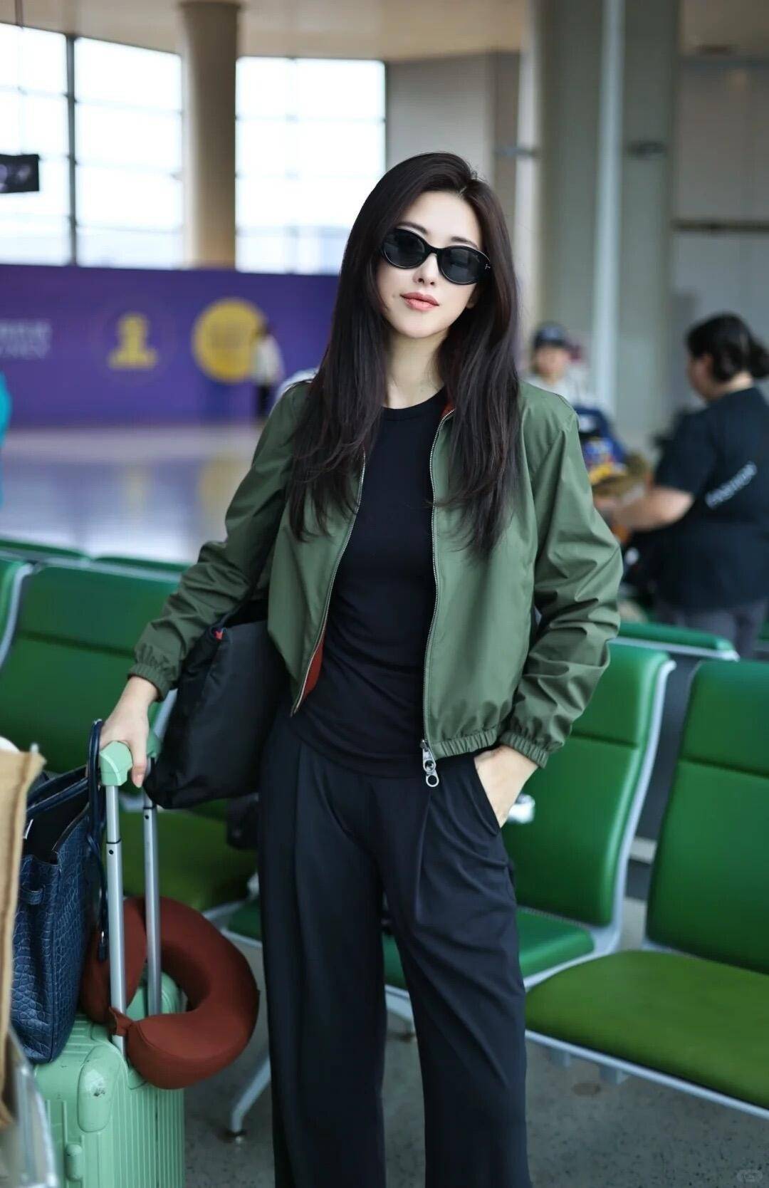 下装搭配的是黑色阔腿裤,材质有垂感,不是那种软塌塌的料子,走起路来带风,显得人特别精神。最绝的是她配了一双黑色小皮鞋,带点复古感,和军绿夹克和阔腿裤呼应,整个搭配色调统一又有层次。