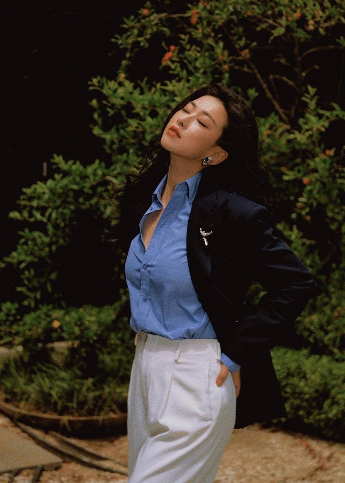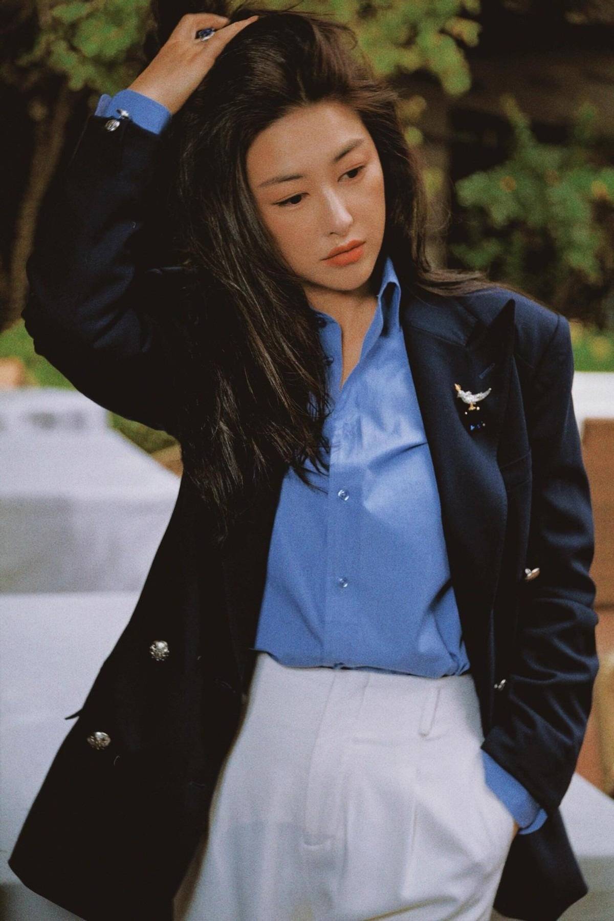 再看这套西装搭配,简直是“职场女王”和“复古名伶”的结合体!藏青色西装选的是有点oversize的版型,垫肩设计让气场直接拉满,但又不会像传统西装那么死板。里面搭一件天蓝色衬衫,解开几颗扣子,露出一点点肌肤,又飒又撩,颜色上藏青和天蓝的碰撞也特别高级,不是那种常见的黑白配,一眼就很有记忆点。